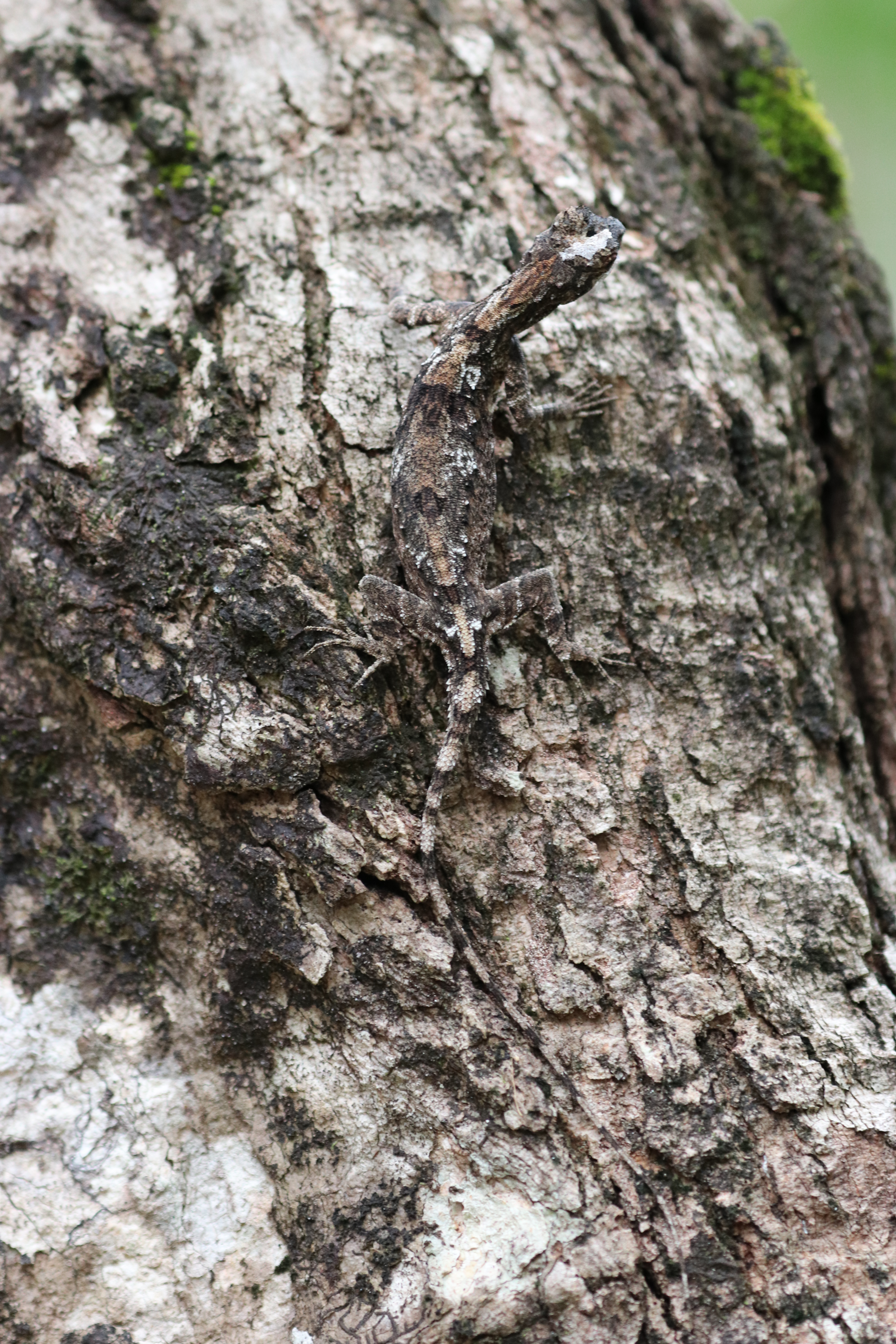 Spot the lizard! The moss and lichen on the bark of the tree enhanced this flying lizard’s camouflage.
