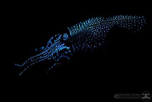 Another example of a bioluminescent animal is the firefly squid, Watasenia scintillans, though it creates light not for hunting, but for protection! The firefly squid produces light to camouflage in brighter surface waters when it comes up from the deep, dark waters to hunt. The light produced matches the surrounding surface waters, hence appear to be “invisible” to its predators.