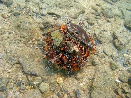 A Collector urchin, Tripneustes gratilla, decorating itself with debris (dried leaves and seaweed, possibly some shells too). What an apt name! Picture credit.