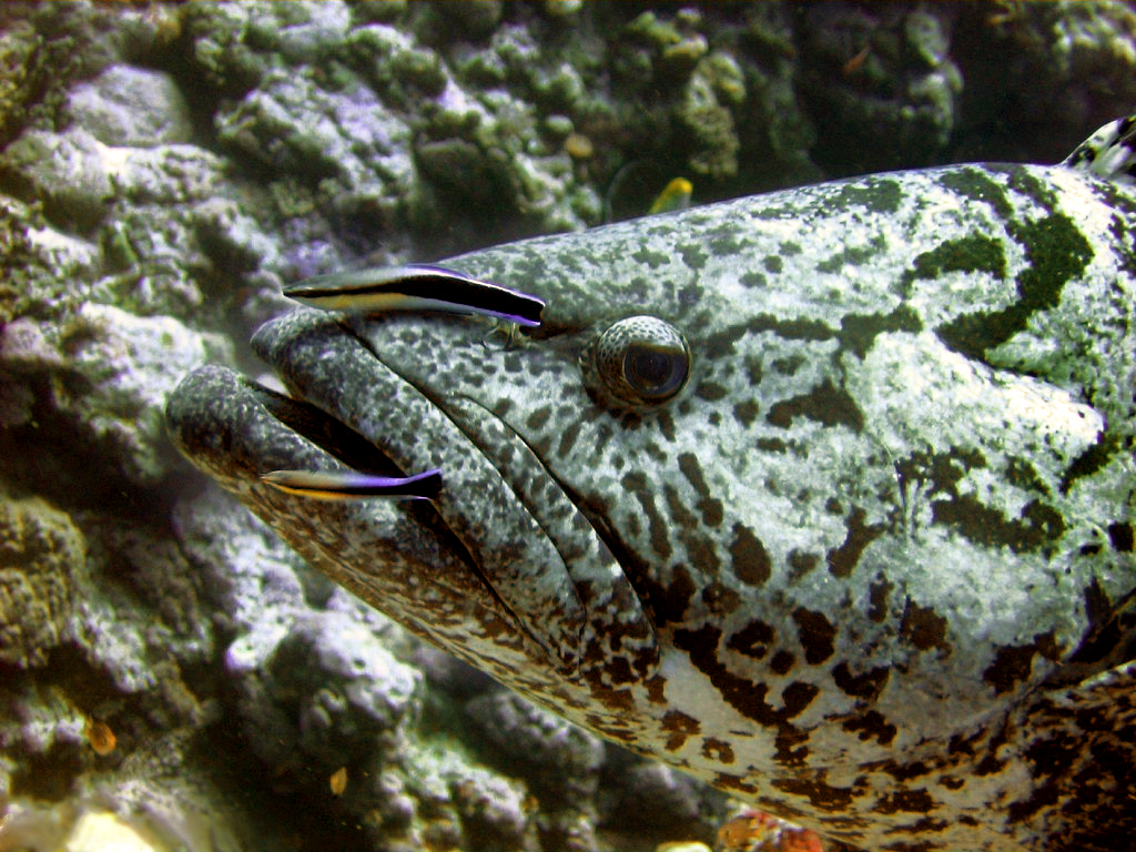 A couple of Bluestreak cleaner wrasse cleaning a grouper. Photo credit.