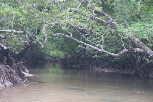 Before reaching the ocean, Sungai Datai comes to an area hidden away from public view, where it becomes wider and slightly deeper, allowing for flowing water to slow down. The path is now a muddy bank and a muddy bottom. This is where the mangrove forest, located on the western part of the resort, begins. Over here, water sometimes flows upstream. This happens during the high tide, causing the salinity of the water to increase, creating brackish water. Different organisms, like mudskippers (Oxudercinids) and halfbeak fish (Hemiramphids), thrive in this part of the river.