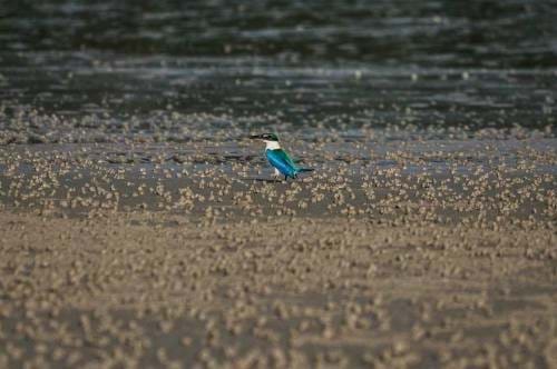 A Collared Kingfisher (Todiramphus chloris) among casts of lugworms by the river mouth.